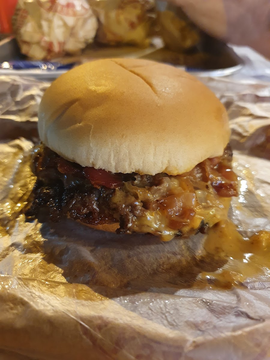 Tudo que você ama no Oklahoma, agora com bacon artesanal! Cebola roxa fatiada caramelizada junto a carne na chapa, coberto com muçarela derretida e nossa maionese da casa. Simples e saboroso.